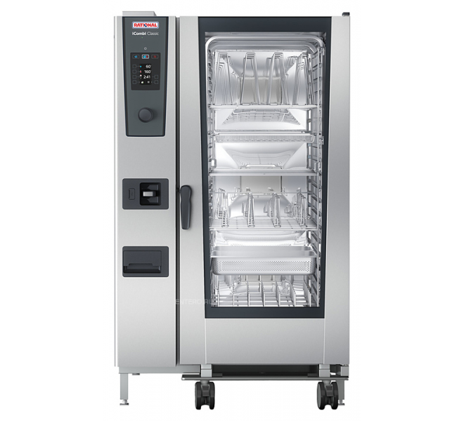 Пароконвектомат Rational iCombi Classic 20-2/1 предназначен для приготовления блюд путём жарки, тушения или варения на предприятиях общественного питания и торговли. Такое оборудование может заменить плиту, жарочный и духовой шкаф, конвекционную печь, опрокидывающуюся сковороду, пищеварочный котел и др. Модель оснащена цветным TFT-дисплеем с мягкими кнопками и поворотным регулятором с функцией Push.