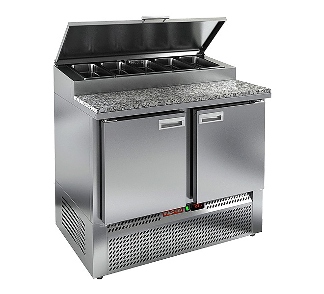 Охлаждаемый стол для пиццы HICOLD PZE1-11/GN (1/3H) выполнен из нержавеющей стали . Верх стола накрыт каменной столешницей. В верхней части стола устанавливаются гастроемкости , максимальной глубиной 150 мм.