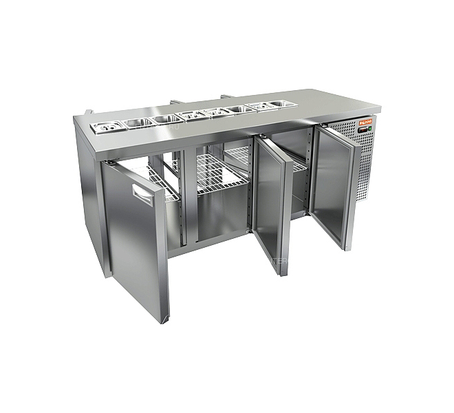 Оборудование с обеих сторон оснащено распашными дверьми, что облегчает доступ к выложенной продукции. Стол полностью выполнен из нержавеющей стали.