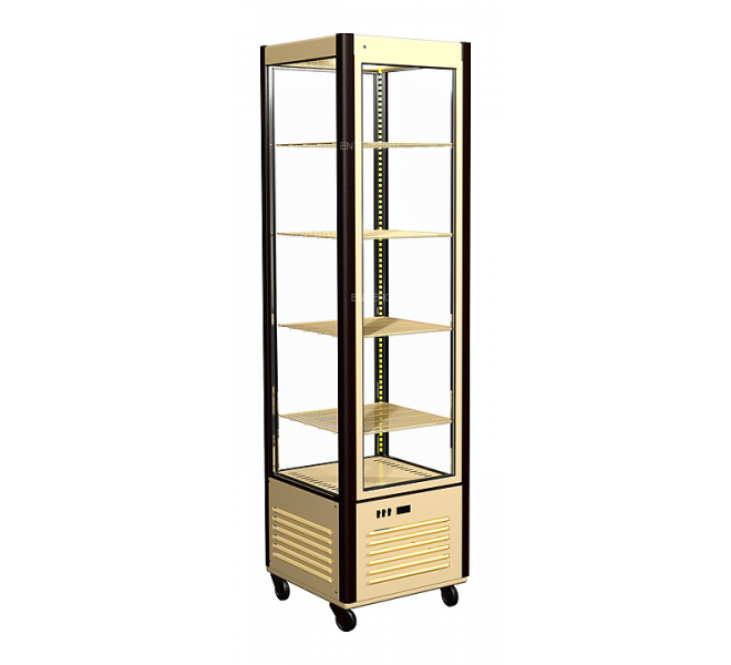 Кондитерская витрина Carboma R400С используется на предприятиях общественного питания и торговли для демонстрации, охлаждения и кратковременного хранения тортов, пирожных и других кондитерских изделий. Модель оснащена 4-х сторонним остеклением, 4 полками-решетками, которые можно устанавливать на разные уровни, и регулируемыми колесами высотой 100 мм.
